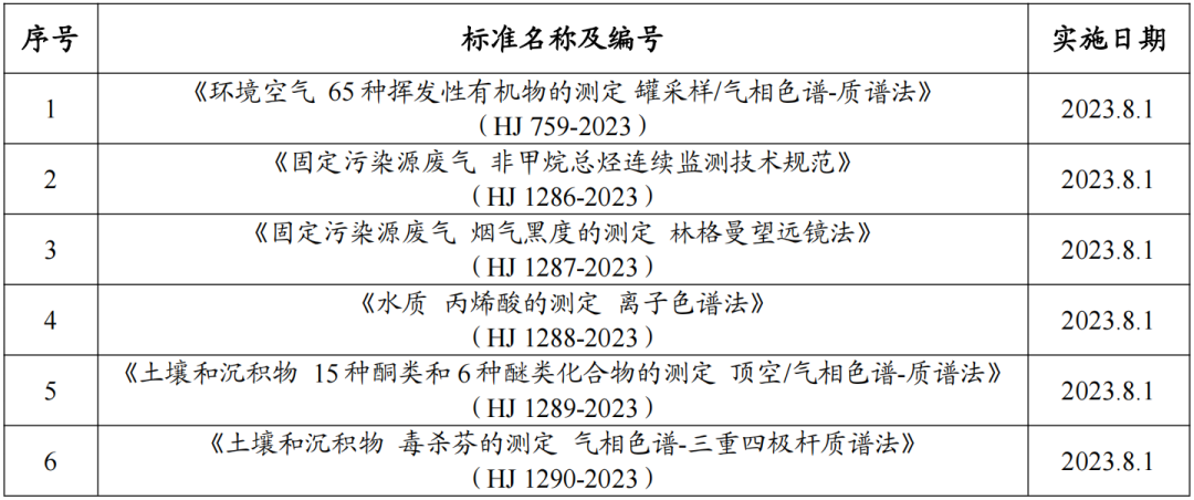 依據(jù)中華人民共和國(guó)生態(tài)環(huán)境部公告2023年第8號(hào),《環(huán)境空氣 65種揮發(fā)性有機(jī)物的測(cè)定 罐采樣/氣相色譜-質(zhì)譜法》(HJ 759-2023)、《固定污染源廢氣 非甲烷總烴連續(xù)監(jiān)測(cè)技術(shù)規(guī)范》(HJ 1286-2023)等6項(xiàng)生態(tài)環(huán)境監(jiān)測(cè)標(biāo)準(zhǔn)將于2023年8月1日起實(shí)施。